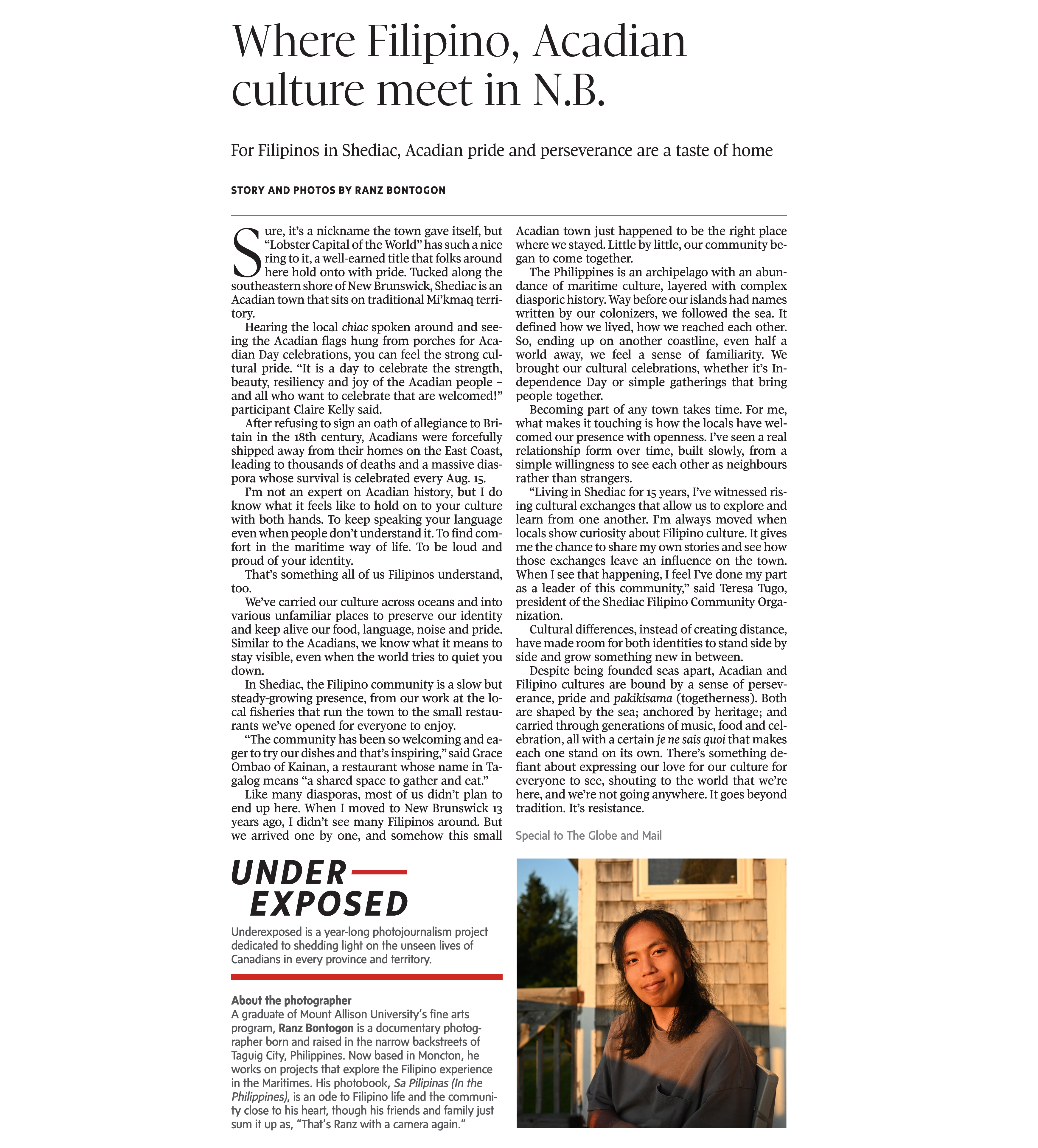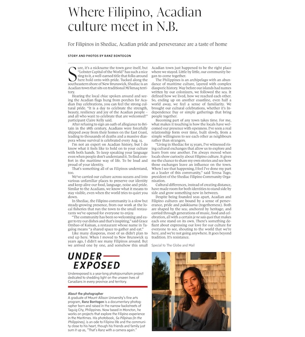 The Globe and Mail’s Underexposed series on the Filipino community finding their place in the Acadian town of Shediac, the lobster capital of the world. Photo and story by Ranz Bontogon.